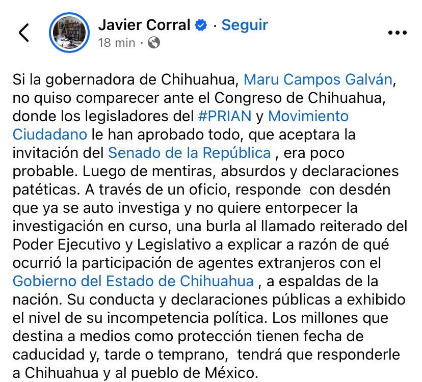 Luego de que la gobernadora de Chihuahua declinara acudir al Senado de la República para abordar la polémica por la presunta intervención de agentes extranjeros en El Pinal, el senador Javier Corral lanzó fuertes señalamientos a través de sus redes sociales.