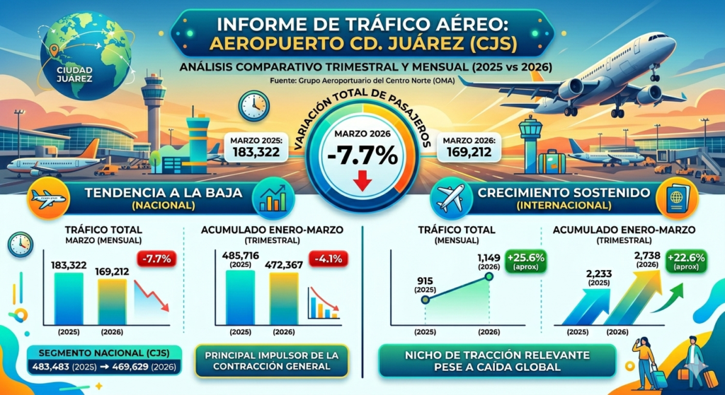 El Aeropuerto Internacional de Ciudad Juárez registró una disminución en el flujo total de pasajeros durante marzo de 2026, de acuerdo con el reporte mensual del Grupo Aeroportuario del Centro Norte (OMA). En el comparativo anual, el número de usuarios pasó de 183,322 en marzo de 2025 a 169,212 en el mismo mes de 2026, […]