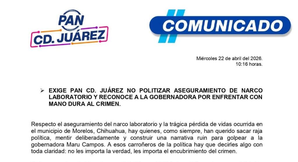 El Comité Directivo Municipal del PAN en Ciudad Juárez, encabezado por Ulises Pacheco, emitió la noche del miércoles un posicionamiento en torno al aseguramiento de un narcolaboratorio y la pérdida de vidas ocurrida en el municipio de Morelos, Chihuahua, donde acusó a actores políticos de intentar “sacar raja” del hecho mediante desinformación y ataques contra […]