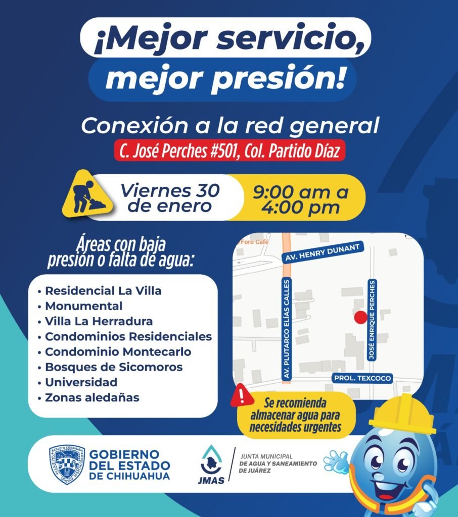 La Junta Municipal de Agua y Saneamiento (JMAS) de Juárez anunció que este viernes 30 de enero llevará a cabo trabajos de conexión a la red general de agua potable para integrar un complejo de oficinas administrativas, lo que provocará afectaciones temporales en el suministro en sectores cercanos a la zona Pronaf.