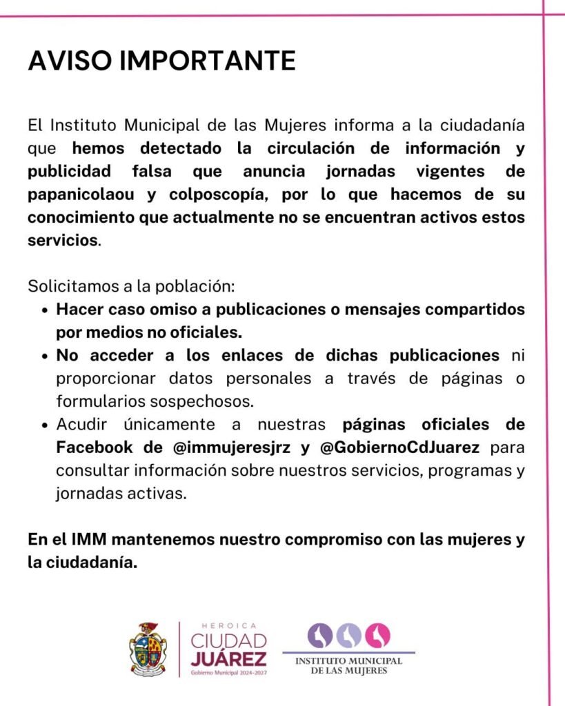 El Instituto Municipal de las Mujeres advirtió a la ciudadanía que actualmente no existen jornadas activas de papanicolaou ni de colposcopía, por lo que llamó a la población a no dejarse llevar por publicaciones que circulan en redes sociales sin confirmación oficial.