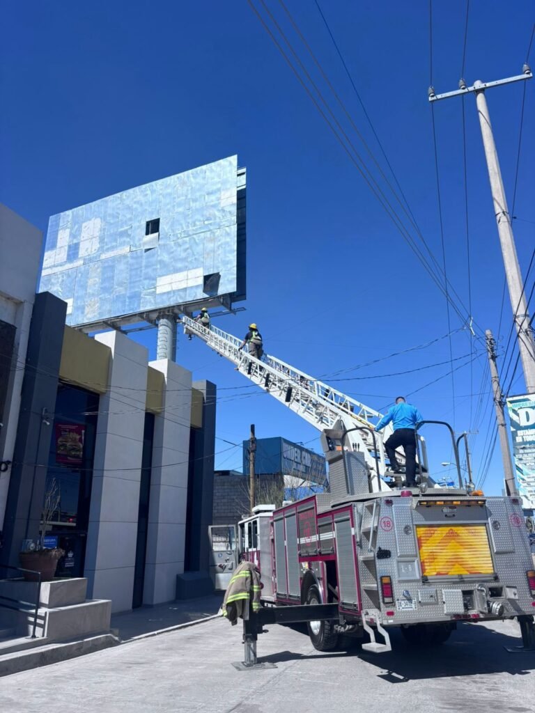 Personal de Protección Civil civil retiró láminas de anuncio espectacular que estaban apunto de caer
