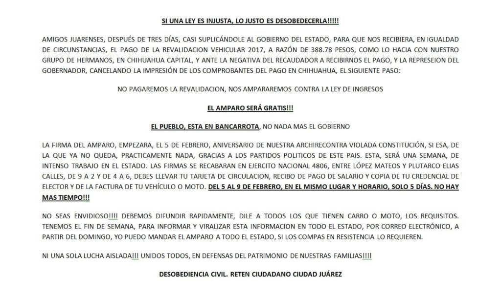 Ante la negativa del gobierno del estado de recibir los pagos de 388 pesos por concepto de revalidación vehicular en Ciudad Juárez, los ciudadanos del retén ciudadano de la zona fronteriza, comenzarán con una campaña de amparos. La abogada y activista Susana Prieto Terrazas, informó que estarían amparándose contra la Ley de Ingresos del ejercicio […]