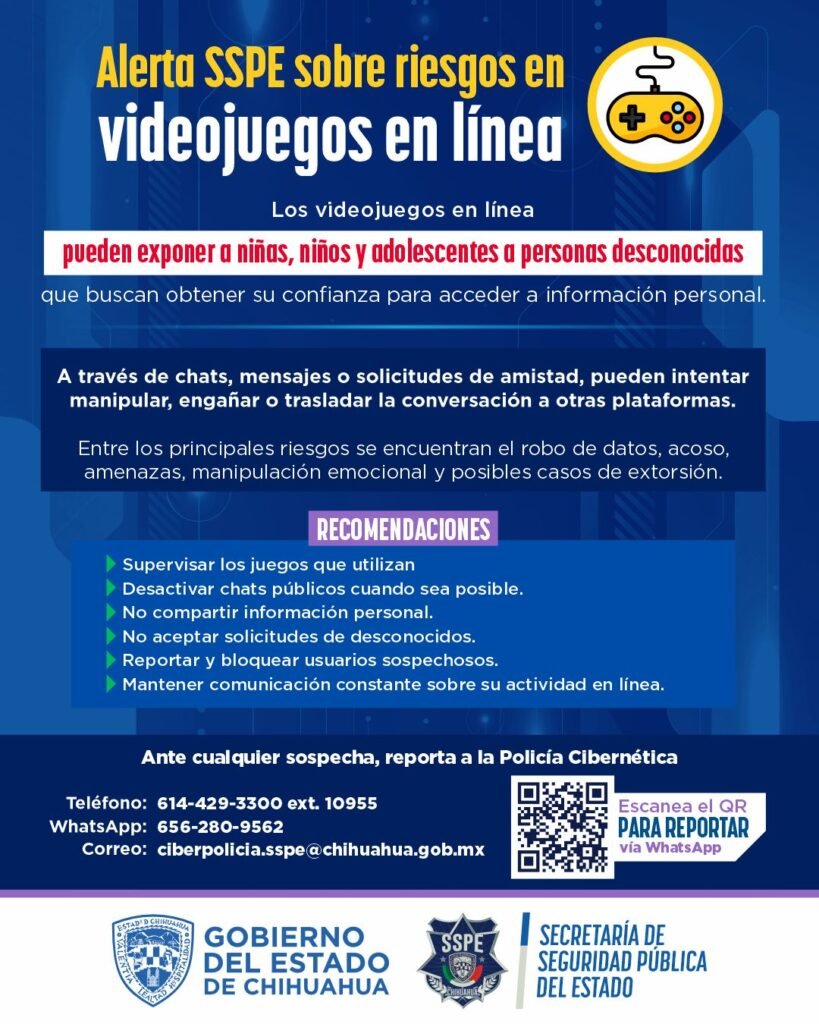 La Secretaría de Seguridad Pública del Estado (SSPE) alerta a madres, padres y tutores sobre los riesgos asociados al uso de videojuegos en línea, donde personas desconocidas pueden interactuar con niñas, niños y adolescentes mediante chats de voz, mensajes y solicitudes de amistad. Aunque estas plataformas representan una forma de entretenimiento, también pueden ser utilizadas […]