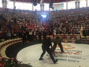 En el poliforum Chihuahua, 110 niños y niñas que hoy se gradúan de la Educación para resistir el uso de drogas y violencia (DARE), fueron testigos de la presentación que hicieron agentes de la Dirección de Segurodad Pública del grupo K-9. Previo al evento de Graduación que encabezaría la presidenta