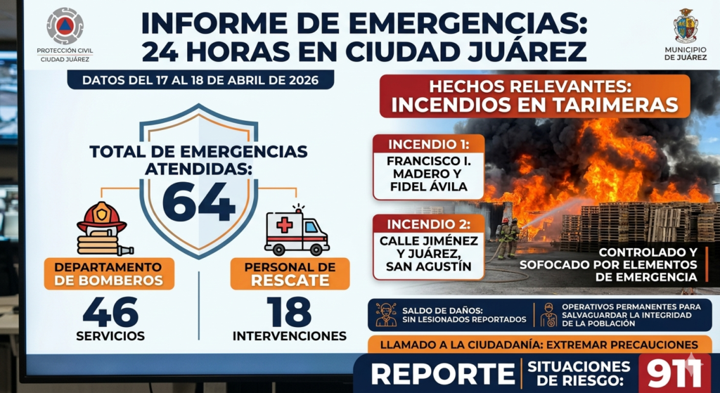 La Dirección General de Protección Civil de Ciudad Juárez informó que durante las últimas 24 horas, comprendidas del 17 al 18 de abril de 2026, se atendieron un total de 64 servicios de emergencia en distintos puntos de la ciudad, siendo los incendios en tarimeras los hechos más relevantes de la jornada. De acuerdo con […]