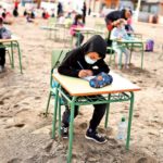 Los alumnos de una escuela primaria en Cartagena, al sur de España, toman clases en la playa, con el fin de evitar el riesgo de contagio de covid-19. Como parte del programa Aire Limpio, cerca de cien estudiantes instalaron un pizarrón, pupitres y mochilas para tomar las clases en la