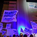 Noticias de Chihuahua.- En punto de las 12:00 de la noche de este domingo, la candidata del PAN a la gubernatura, María Eugenia Campos Galván, arrancó de manera simbólica su campaña con la develación de un espectaular en la plaza comercial Puerta Norte. En el evento estuvieron presentes el presidente