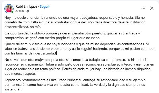 La presidenta del DIF Municipal de Ciudad Juárez, Rubí Enríquez, confirmó la salida de Erika Prado Núñez de la institución, hecho que se dio a conocer la tarde de este día. Se reconoció el trabajo de Prado Núñez, a quien describió como una persona comprometida y cumplida durante el tiempo que formó parte del equipo. […]