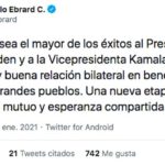 Tras la llegada de Joe Biden a la Casa Blanca como el presidente número 46 de los Estados Unidos, el secretario de Relaciones Exteriores (SRE), Marcelo Ebrard, le envió un mensaje a través de Twitter en el cual mostró su apoyo y deseos de éxito hacia el mandatario estadounidense, así
