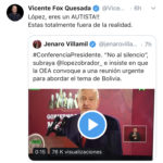 El expresidente Vicente Fox causó polémica en redes sociales luego de que criticara la actuación de Andrés Manuel López Obrador ante los sucesos en Bolivia, llamándolo “autista”. Más tarde, el ex mandatario se disculpó. A través de su cuenta de Twitter, el político guanajuatense escribió: “López, ¡eres un autista! Estás