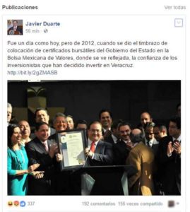 El ex gobernador de Veracruz, Javier Duarte de Ochoa realizó una publicación en su cuenta de Facebook, haciendo memoria sobre una noticia que se dio a conocer en 2012, informó Excélsior. Esta es la primera publicación que efectúa desde que anunció que presentaría su licencia al cargo de gobernador y