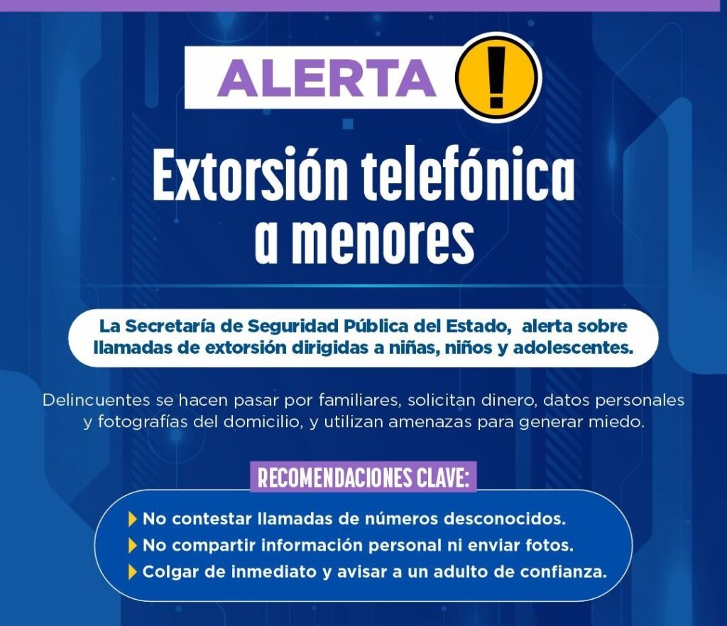 La Secretaría de Seguridad Pública del Estado (SSPE) advierte a la población sobre un esquema reciente de extorsión telefónica que tiene como blanco a niñas, niños y adolescentes, el cual ha sido identificado a partir de denuncias ciudadanas recibidas en los últimos días. Según lo detectado, los responsables realizan llamadas, en su mayoría a líneas […]