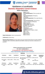 La Fiscalía Especializada en Atención a Mujeres Víctimas del Delito por Razones de Género y la Familia (FEM) emitió 3 pesquisas por la desaparición de 3 hermanas menores de edad. Se trata de Daniela Alejandra, Kimberly Joseline y Camila Rocío, todas de apellidos Corral Chávez; de 15, 12 y 14