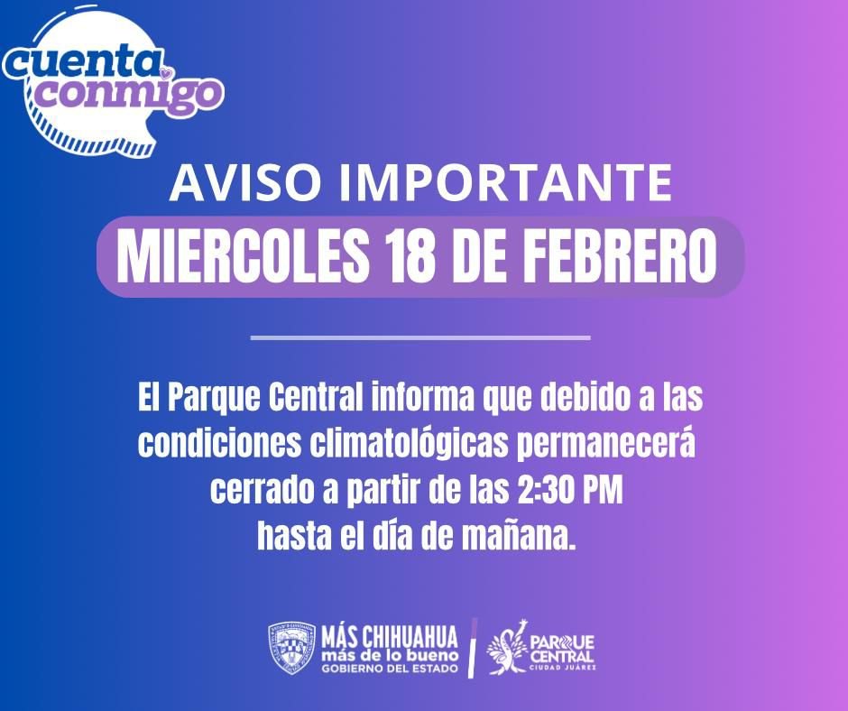 El Parque Central informó que este 18 de febrero suspenderá actividades a partir de las 2:30 de la tarde y hasta nuevo aviso, atendiendo las recomendaciones emitidas por la Coordinación Estatal de Protección Civil, debido a las condiciones climatológicas registradas durante la jornada.