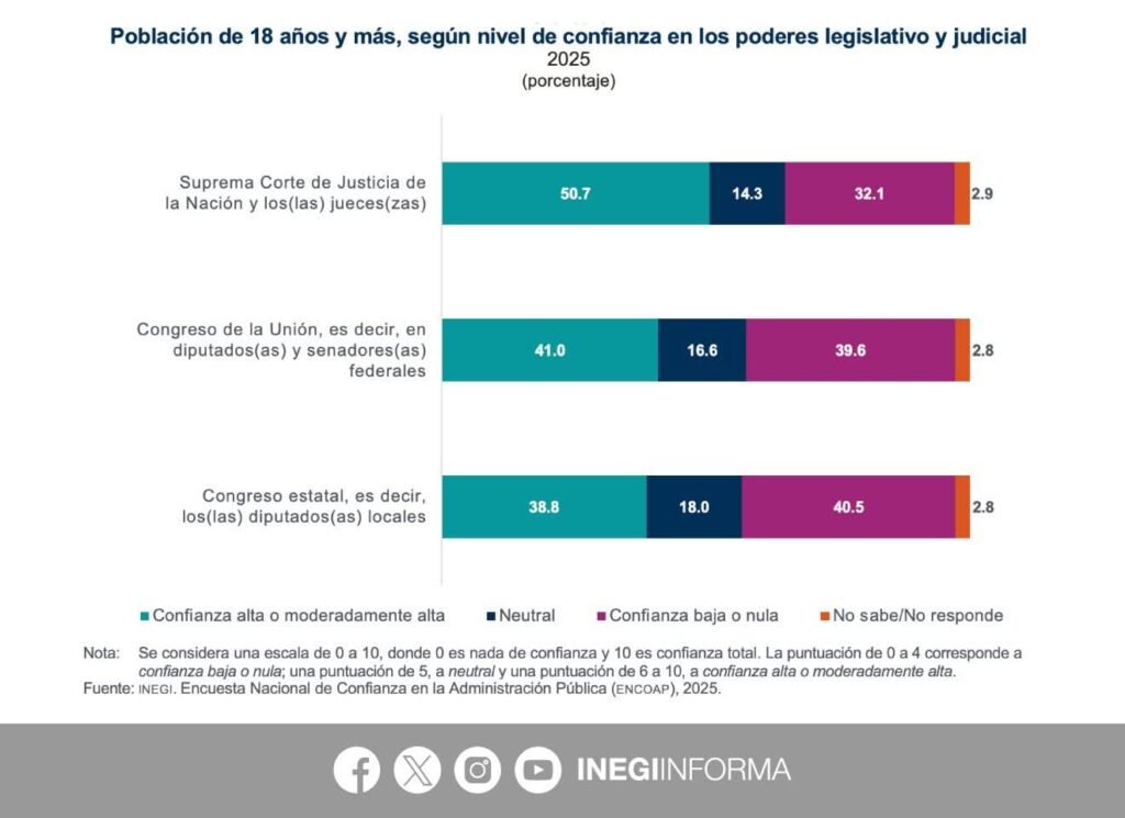Por su parte, la Suprema Corte de Justicia de la Nación y las personas juzgadoras obtuvieron un 50.7 por ciento de confianza, reflejando una evaluación más dividida entre los ciudadanos. Estos resultados evidencian que, si bien persisten niveles aceptables de confianza institucional, aún existen áreas donde la percepción pública podría fortalecerse.