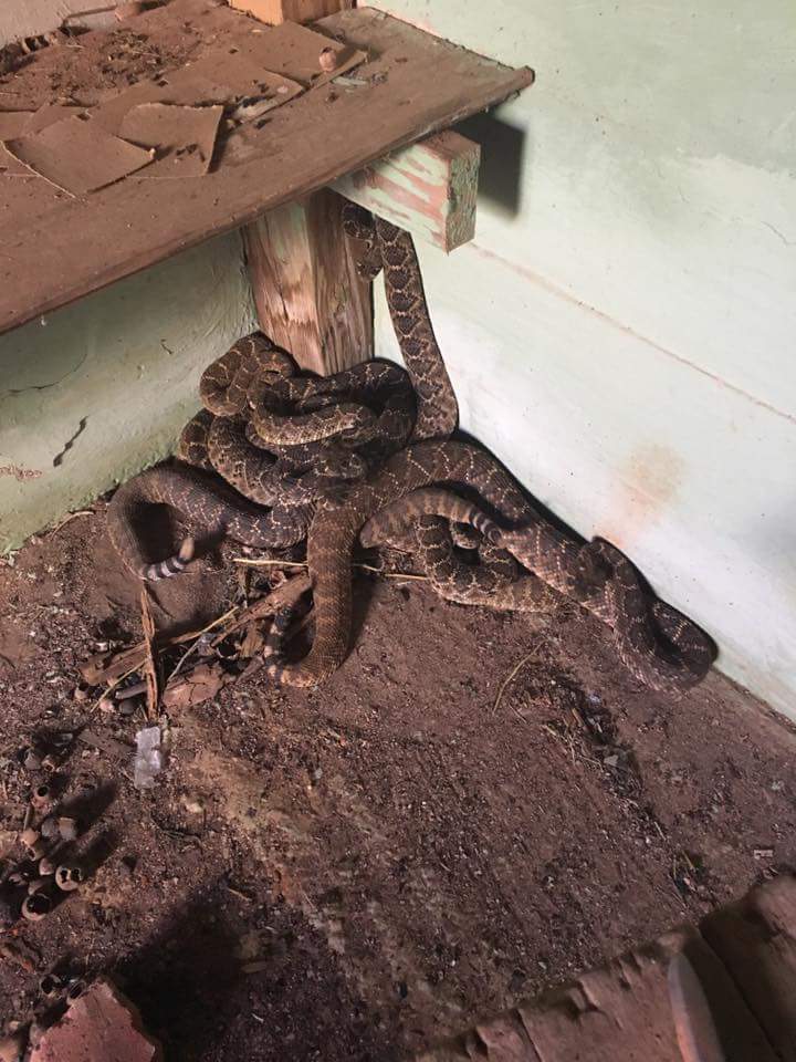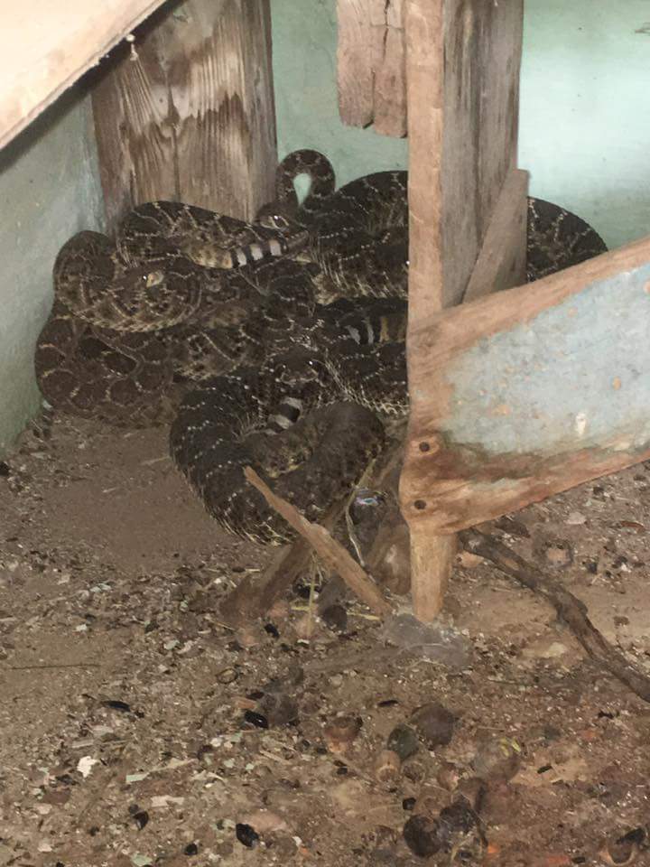“Esta fue la primera serpiente que la familia ha visto en su propiedad en varios años. Cuando llegamos, notamos algunas áreas problemáticas. La intuición nos llevó directamente a un sótano antitormentas, donde encontramos 13 serpientes cascabel adultas. Después de una exhaustiva revisión del perímetro encontramos otras 10 serpientes debajo de la casa. La familia no tenía ni idea”, describe la empresa en su cuenta de Facebook.