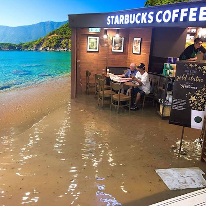 A este hombre que se hallaba en un establecimiento de café en Hong Kong, China, parece no importarle que todo el piso del lugar se encuentre inundado.