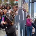 Dicho TikTok, muestra cómo la mujer se arrodilla para pedirle matrimonio a la figura de BTS mientras algunas personas graban con su celular y gritan de la emoción.
