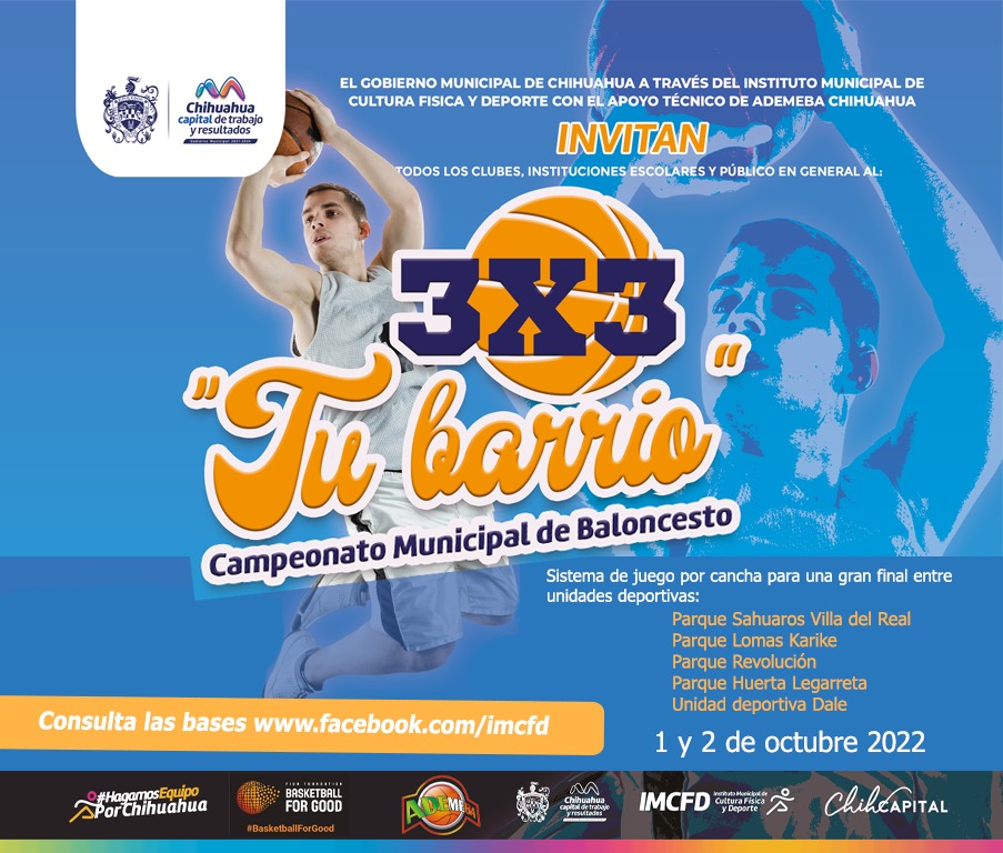 El Gobierno Municipal de Chihuahua a través del Instituto Municipal de Cultura Física y Deporte invita a mujeres y hombres entre los 12 y 17 años de edad, a participar en el primer “Campeonato municipal de Baloncesto en tu Barrio”, que se llevará a cabo los días 1 y 2 de octubre en cinco unidades deportivas.