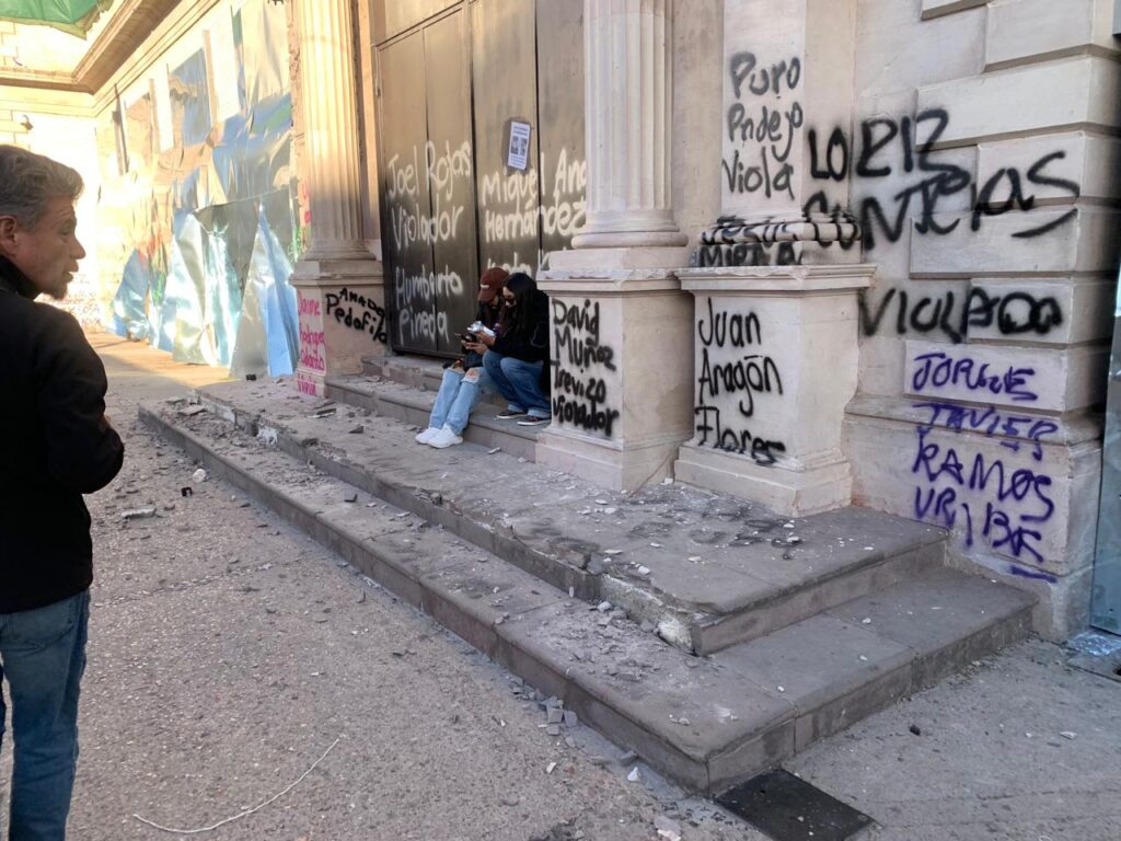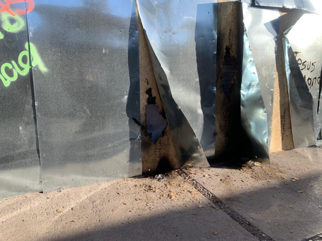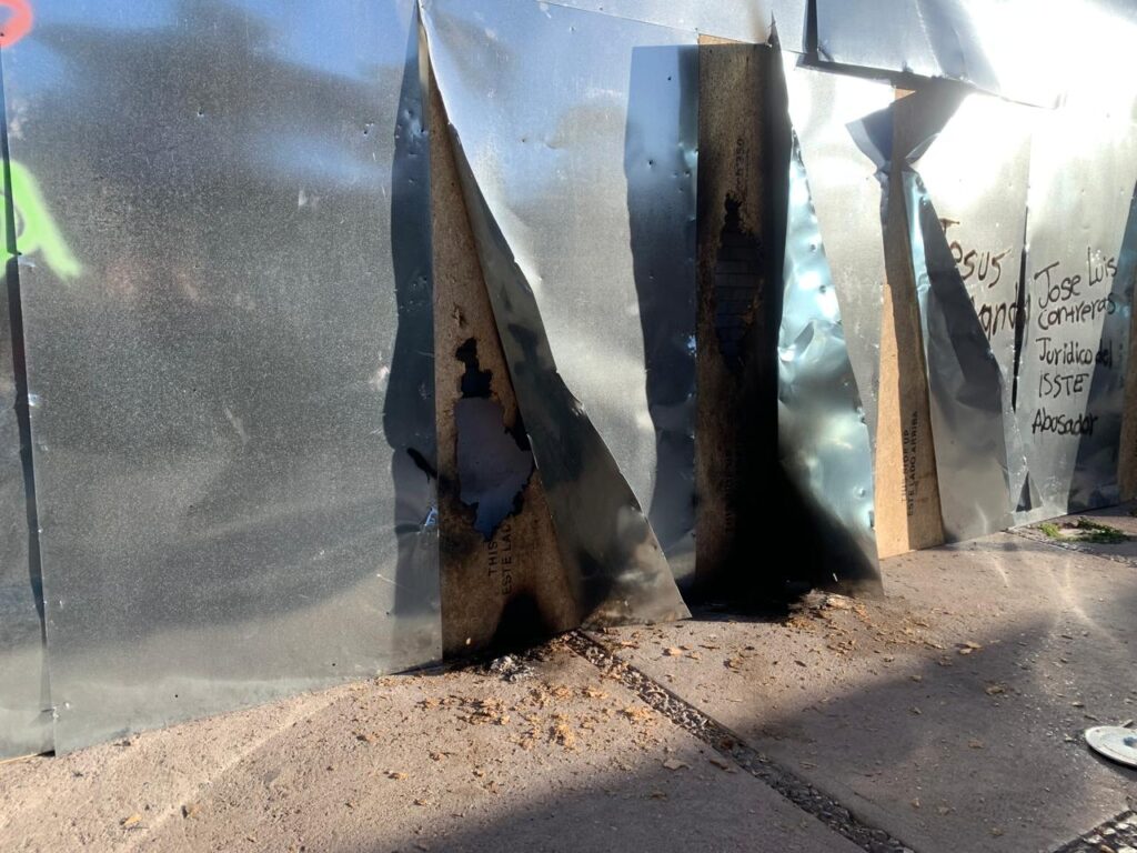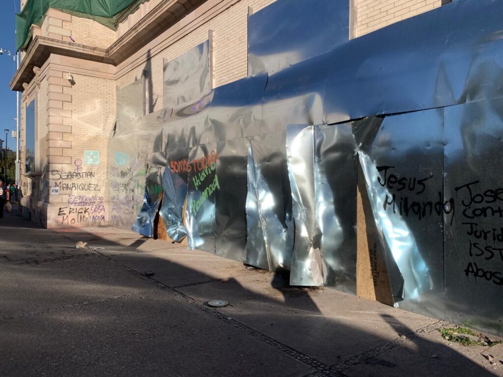 El muro metálico fue golpeado, pintado y cubierto con carteles que denunciaban casos de violencia, deudores alimentarios y presuntos agresores. También se colocaron pesquisas de mujeres desaparecidas, dejando evidencia de las múltiples violencias que enfrentan las mujeres día con día.