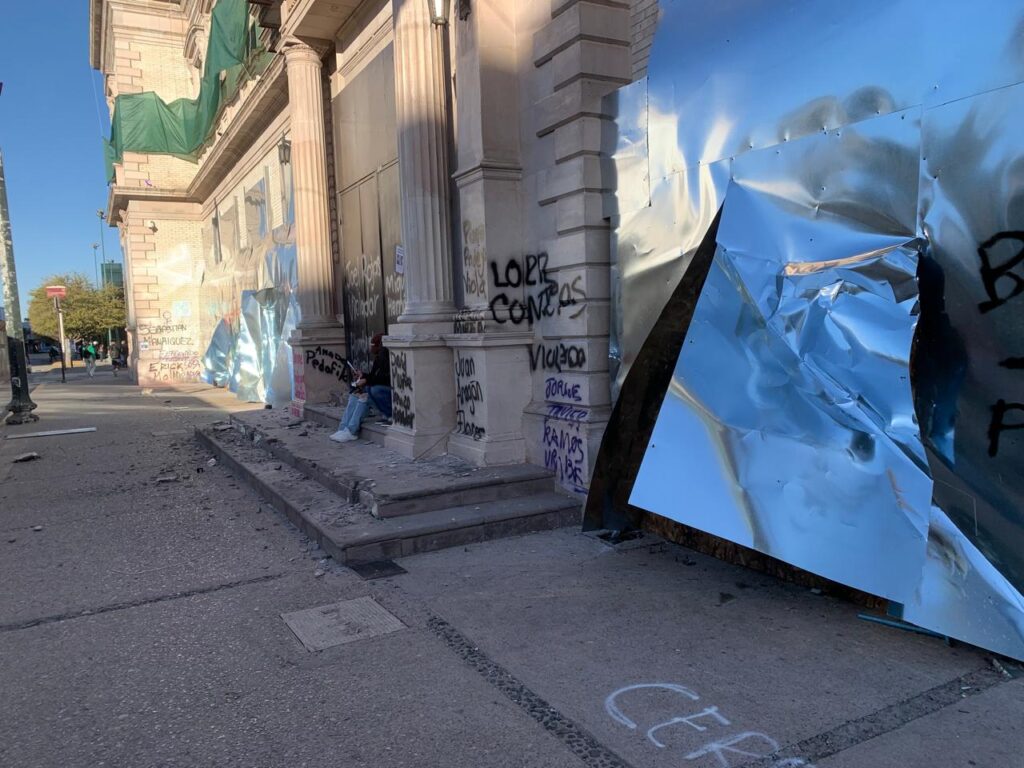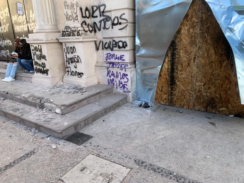 Frente a las vallas, las asistentes también realizaron pintas con frases como “Nos sembraron miedo, nos crecieron alas” y “No es vandalismo, es desesperación”, dejando claro que la rabia e indignación ante la violencia de género sigue latente.