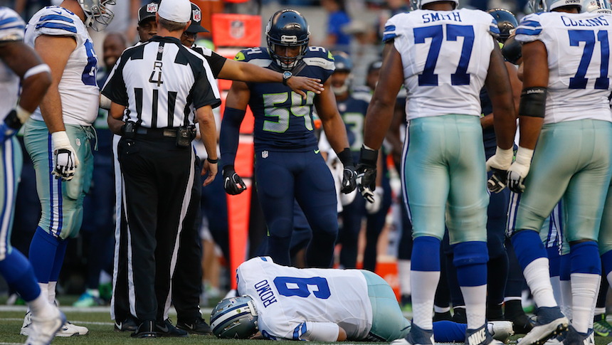 El mariscal de campo del equipo texano salió lesionado después de que recibió un golpe en la espalda por parte de Cliff Avril. En la jugada se puede ver que Romo abandona la bolsa de protección y al momento de deslizarse no se da cuenta que el jugador de Seattle está detrás de él y lo golpea.