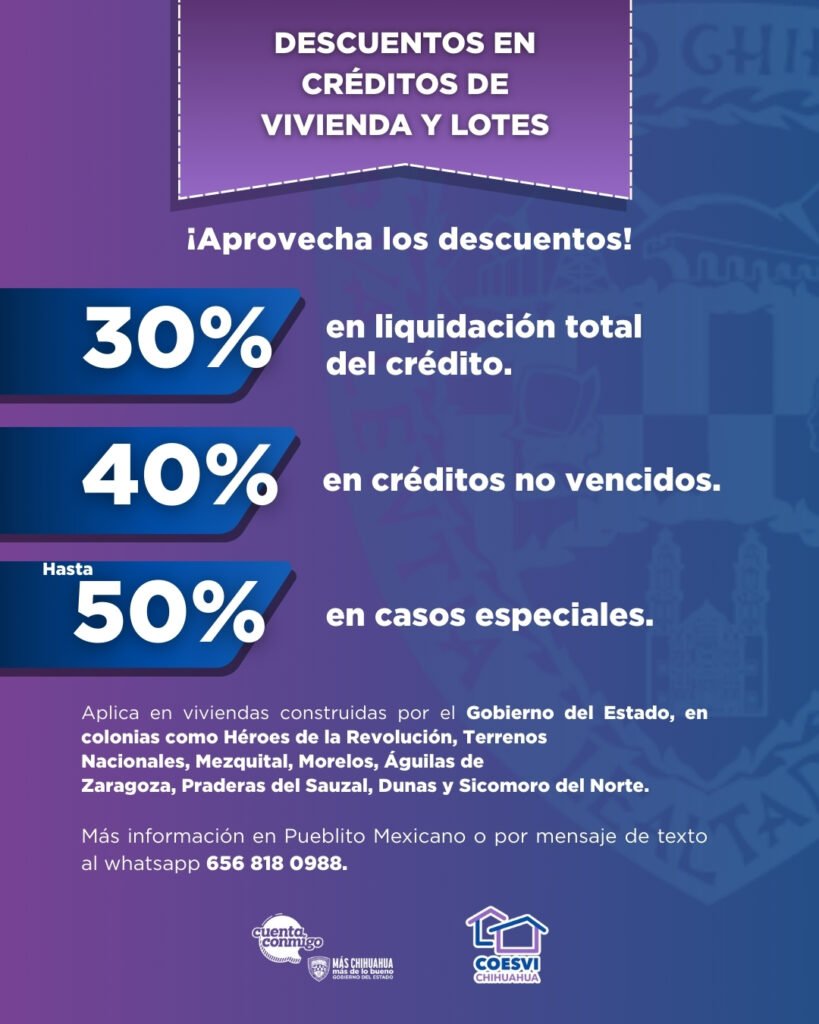 El Gobierno del Estado anunció la ampliación del programa de descuentos para la liquidación de créditos de vivienda y lotes, el cual permanecerá vigente durante todo el año 2026, con el propósito de apoyar la economía de las familias de Ciudad Juárez que cuentan con financiamiento otorgado por la Comisión Estatal de Vivienda, Suelo e Infraestructura (Coesvi).