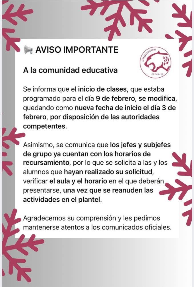 El Centro de Estudios Tecnológicos Industrial y de Servicio (CBTIS) 128 informa a la comunidad educativa que el inicio de clases, originalmente programado para el día 9 de febrero, ha sido modificado. Por disposición de las autoridades competentes, la nueva fecha de inicio de actividades escolares será el 3 de febrero, por lo que se solicita tomar en cuenta este cambio para su organización personal y académica.