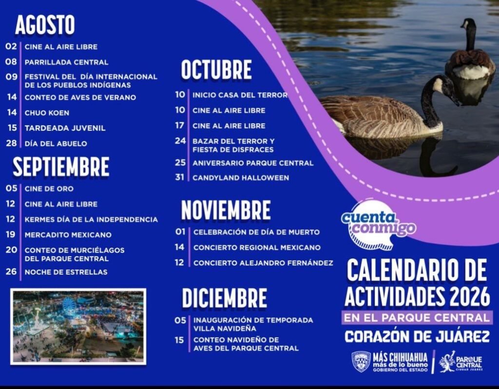 El Gobierno del Estado de Chihuahua dio a conocer la agenda de actividades 2026 del Parque Central de Ciudad Juárez, la cual contempla más de 60 eventos distribuidos a lo largo del año, con el objetivo de mantener este espacio como un punto constante de encuentro para la comunidad.