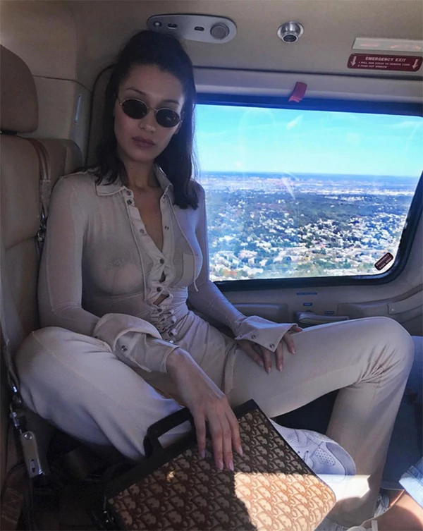 Para ese paseo por los aires, la ex de The Weeknd eligió un sobrio traje de dos piezas color beige de Paco Rabanne, pero que eligió usarlo sin sujetador.