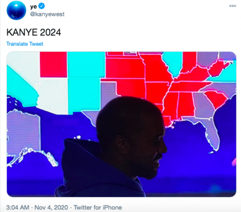 West ha publicado un escueto mensaje en Twitter en el que aparece delante de una foto del mapa electoral de Estados Unidos, marcado con los colores de los partidos republicano y demócrata, y la ha acompañado de un mensaje corto, pero potente. “Bien”, escribió el rapero. “Kanye 2024”.