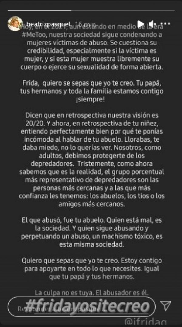 En una historia de Instagram, la madrastra de Frida utilizó el hashtag #fridayositecreo y expresó que la apoya y reclama que, en la actualidad, todavía se cuestiona la credibilidad de las mujeres que han sufrido acoso sexual.