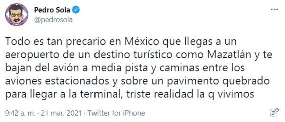 “Todo es tan precario en México que llegas a un aeropuerto de un destino turístico como Mazatlán y te bajan del avión a media pista y caminas entre los aviones estacionados y sobre un pavimento quebrado para llegar a la terminal, triste realidad la q vivimos (sic)”, escribió Pedro Sola en Twitter.