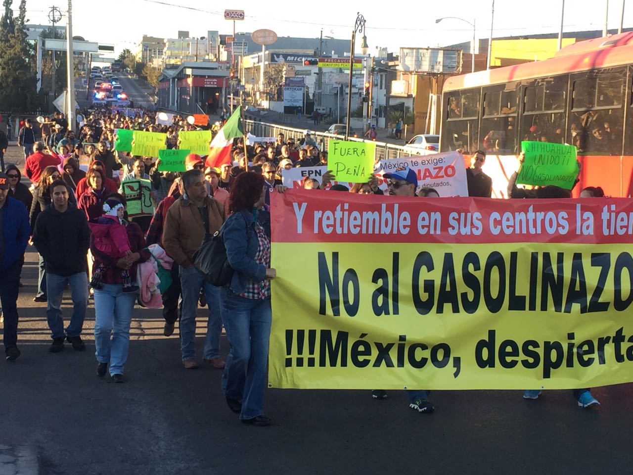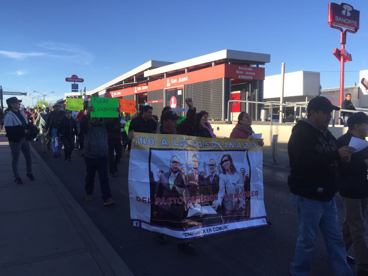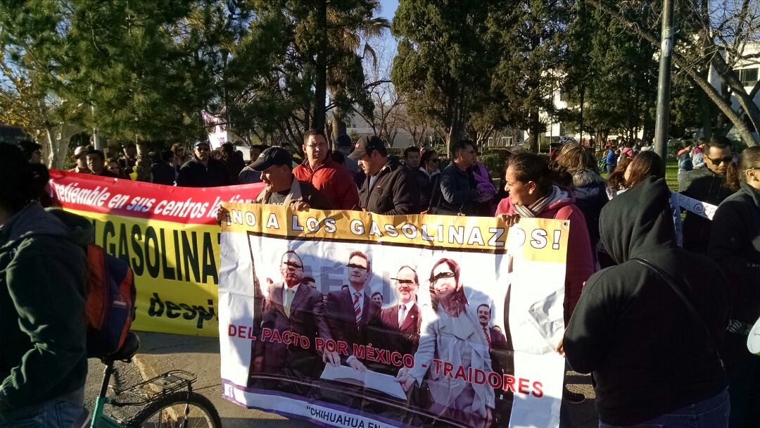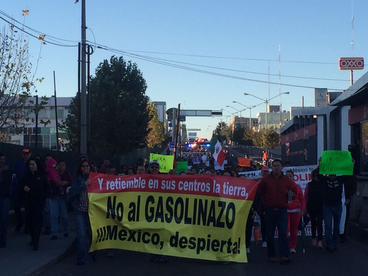 Al filo de las 16:00 horas en la glorieta de Pancho Villa ubicada en la División del Norte y Universidad, chihuahuenses alzaron la voz y marcharon contra el ‘gasolinazo’ puesto por el presidente de México, Enrique Peña Nieto.
