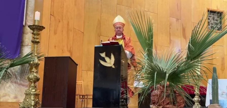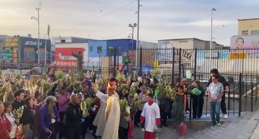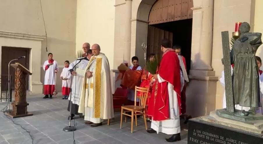 El obispo José Guadalupe Torres Campos, se hizo acompañar de otros sacerdotes y los monaguillos al exterior de la Misión de Guadalupe dio un mensaje, para luego proceder a bendecir las palmas. Torres Campos al igual que otros años externó que estos ramos que hemos preparado, sean la expresión de nuestra fe, es donde brota la aclamación “bendito el que viene”, mencionó a los fieles.