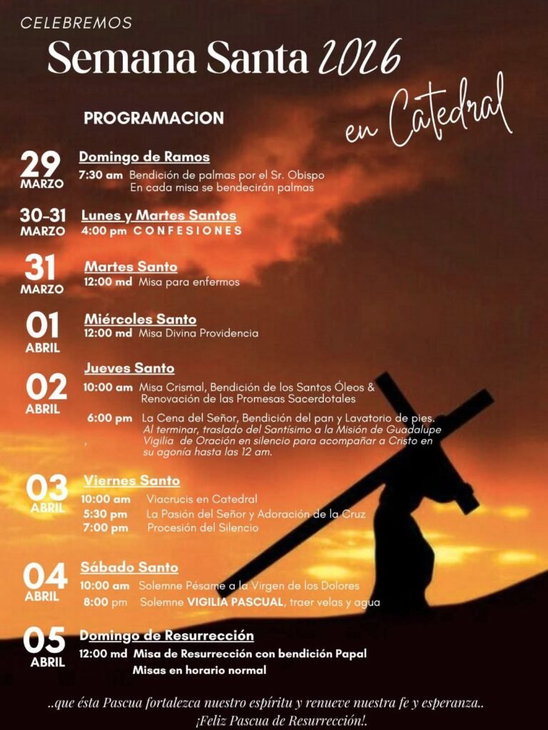 Para el 03 de abril, Viernes Santo, se realizará el Viacrucis en Catedral (así como en otros templos), a las 5:00 de la tarde la Pasión del Señor y adoración a la cruz y a las 7:00 pm la procesión del silencio; el sábado 04 de abril, Sábado Santo, a las 10:00 se dará le solemne pésame a la virgen de los Dolores y a las 8:00 pm la solemne Vigilia Pascual por lo que se pide llevar velas y agua.
