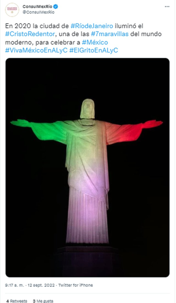 En Río de Jainero, el Cristo Redentor, una de las 7 maravillas del mundo, también se vistió de colores de la bandera de México, para celebrar el 15 de septiembre.