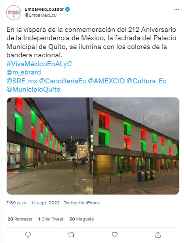 En víspera del 212 aniversario del Día de la Independencia, Ecuador decidió conmemorar la fecha con una iluminación tricolor referente a la bandera nacional.