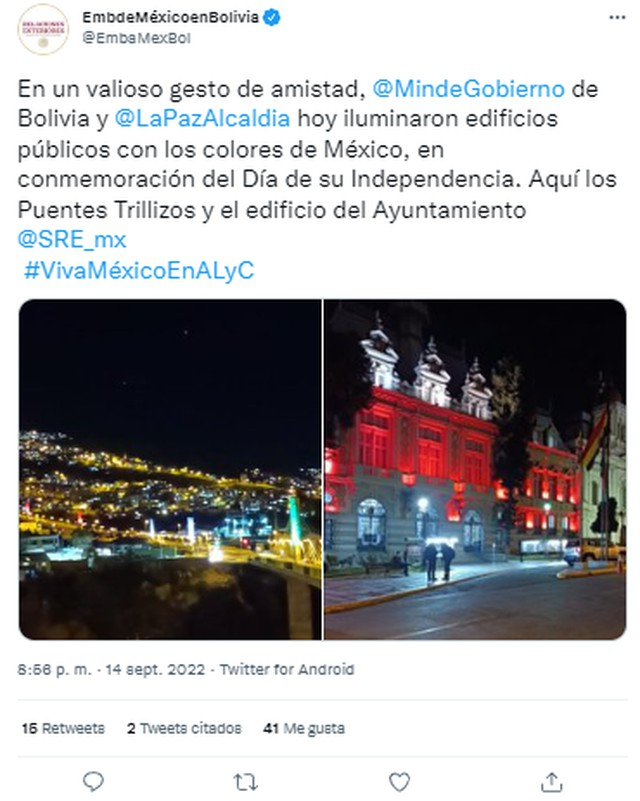 El ministerio de Bolivia también conmemoró el 15 de septiembre, pues vistió su monumento de los Puentes Trillizos y el Ayuntamiento de Bolivia con los colores de la bandera de México.