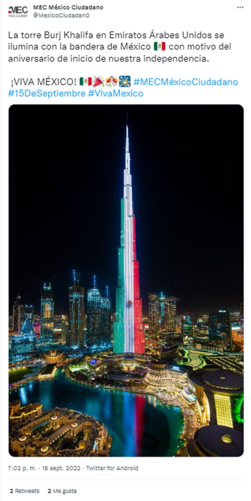 Considera el edificio más alto del mundo, pues cuenta con una altura de 828 metros. El monumento originario de Dubai decidió unirse al 15 de septiembre con colores de la bandera de México.