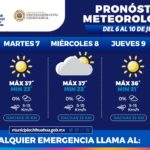 La Coordinación Municipal de Protección Civil, informa que las temperaturas durante la semana se tendrán días calurosos por lo que es importante no permanecer por tiempos prolongados bajo los rayos del sol, a fin de prevenir deshidrataciones u otras complicaciones de salud, así mismo se informa no se esperan precipitaciones.