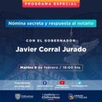 “Acompaña el programa especial en que el gobernador Javier Corral dará a conocer información sobre la denominada “nómina secreta”, así como las acciones en torno de las declaraciones de un notario público de la ciudad de Chihuahua”, señala el anuncio del gobierno estatal.