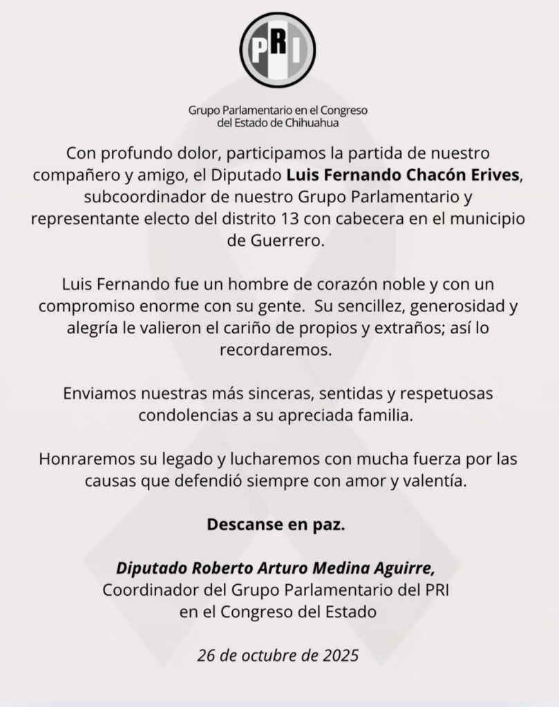 El coordinador del Grupo Parlamentario del PRI, Arturo Medina, lamentó el fallecimiento del diputado Luis Fernando Chacón, subcoordinador de la bancada priista.