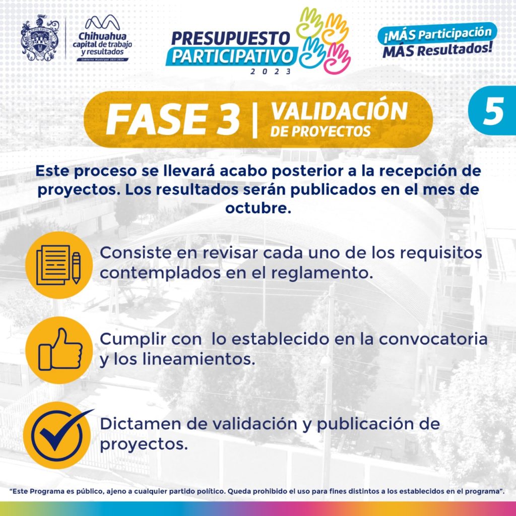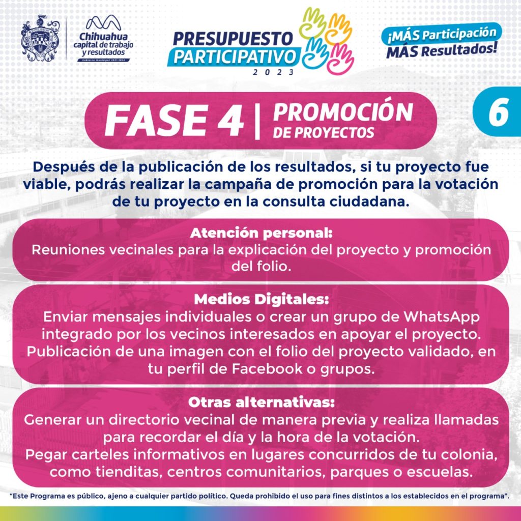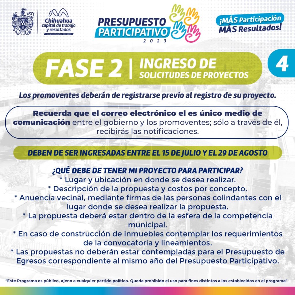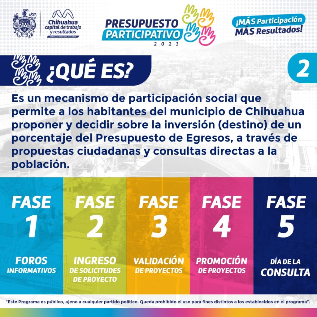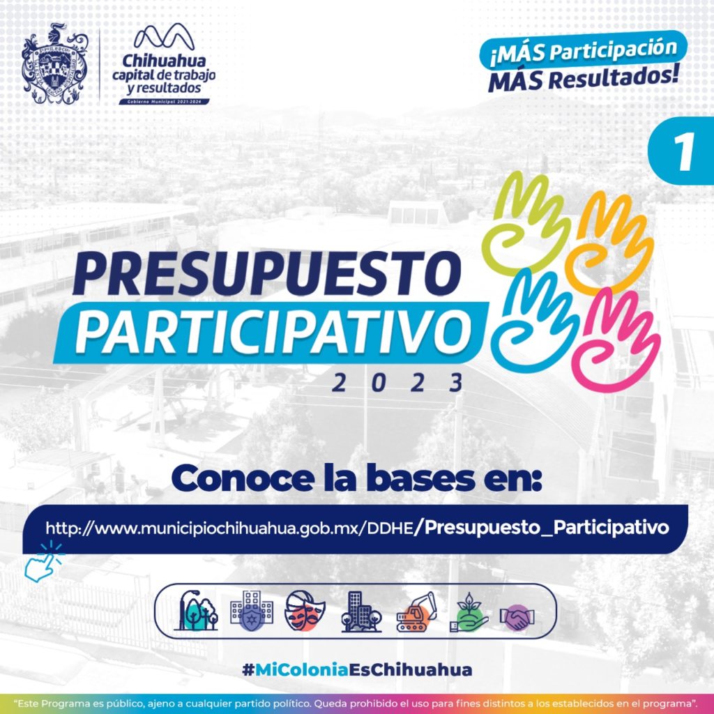 Como parte de las acciones para involucrar a la ciudadanía en el mejoramiento de sus colonias, el Gobierno Municipal, a través de la Dirección de Desarrollo Humano y Educación, invita a los chihuahuenses a inscribir sus propuestas de proyectos en el Presupuesto Participativo 2023.