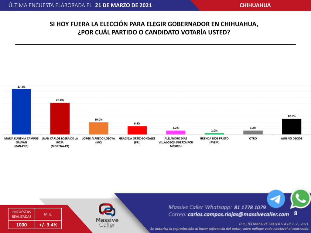 Según la más reciente encuesta de Massive Caller de cara a la renovación de la gubernatura de Chihuahua, señala que la candidata del PAN-PRD, Maru Campos, aventaja por poco más de un 11 puntos al candidato de Morena, PT y Nueva Alianza, Juan Carlos Loera.
