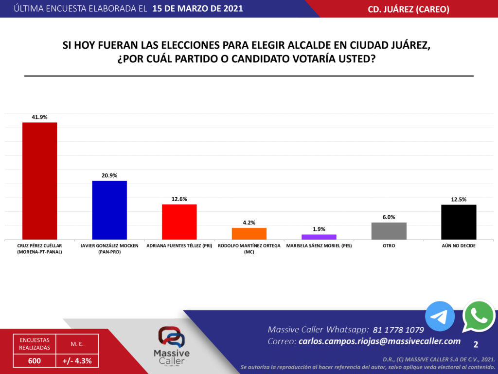 Según la encuestadora, el morenista Cruz Pérez Cuéllar aparece con el 41.9 por ciento de la intención del voto, seguido por el candidato del PAN, Javier González Mocken, con el 20.9 por ciento.