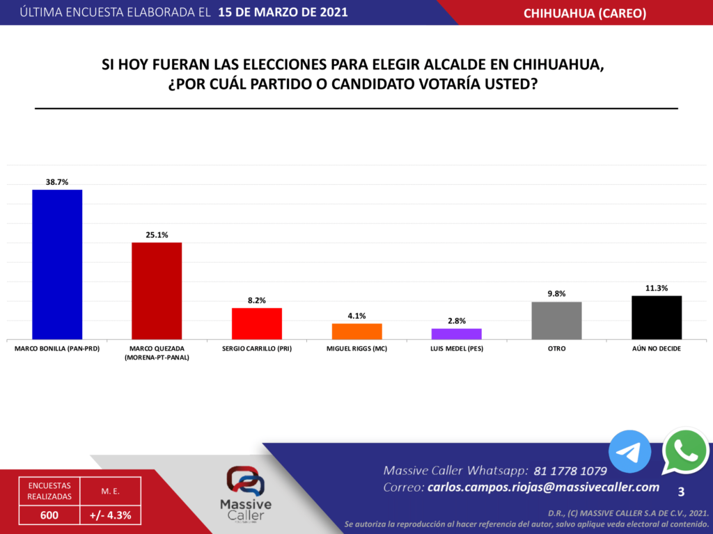 En lo que respecta a Chihuahua capital, el panista Marco Bonilla encabeza las preferencias electorales con el 38.7 por ciento, seguido por el candidato de Morena, Marco Quezada, con el 25.1 por ciento de la intención del voto de los capitalinos.