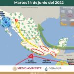 Mesa del Norte: Cielo parcialmente nublado y ambiente matutino fresco por la mañana, siendo frío en zonas altas de Durango. Por la tarde, cielo nublado con lluvias puntuales fuertes en Chihuahua y San Luis Potosí, chubascos en Durango y Zacatecas, además de lluvias aisladas en Coahuila, Nuevo León y Aguascalientes, todas las lluvias con descargas eléctricas y posible caída de granizo. Ambiente caluroso a muy por la tarde. Dominará viento de componente este de 15 a 30 km/h, con rachas de 60 a 70 km/h y tolvaneras en Chihuahua, Coahuila, Nuevo León, Zacatecas y San Luis Potosí, así como con rachas de 50 a 60 km/h en Durango.