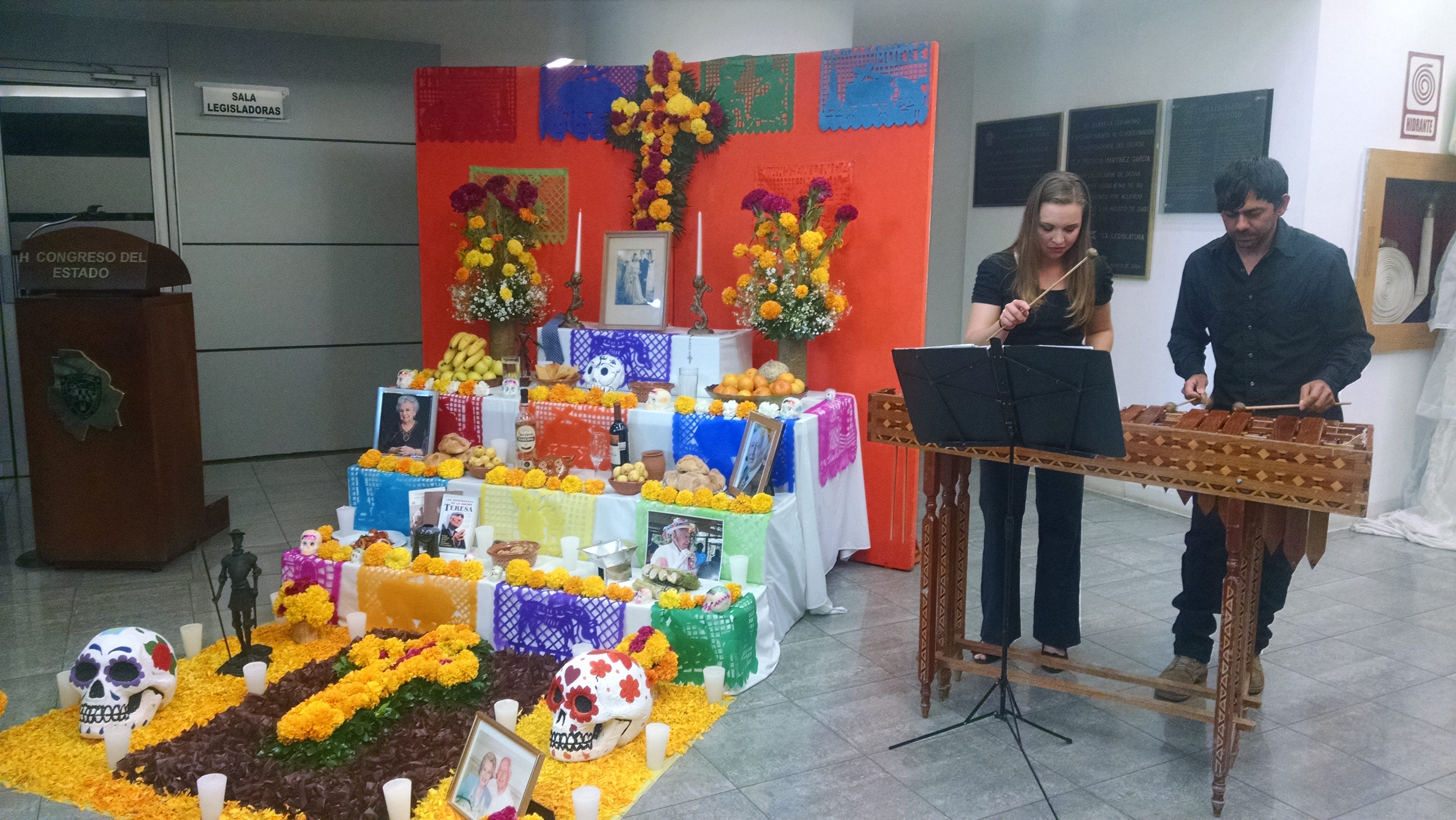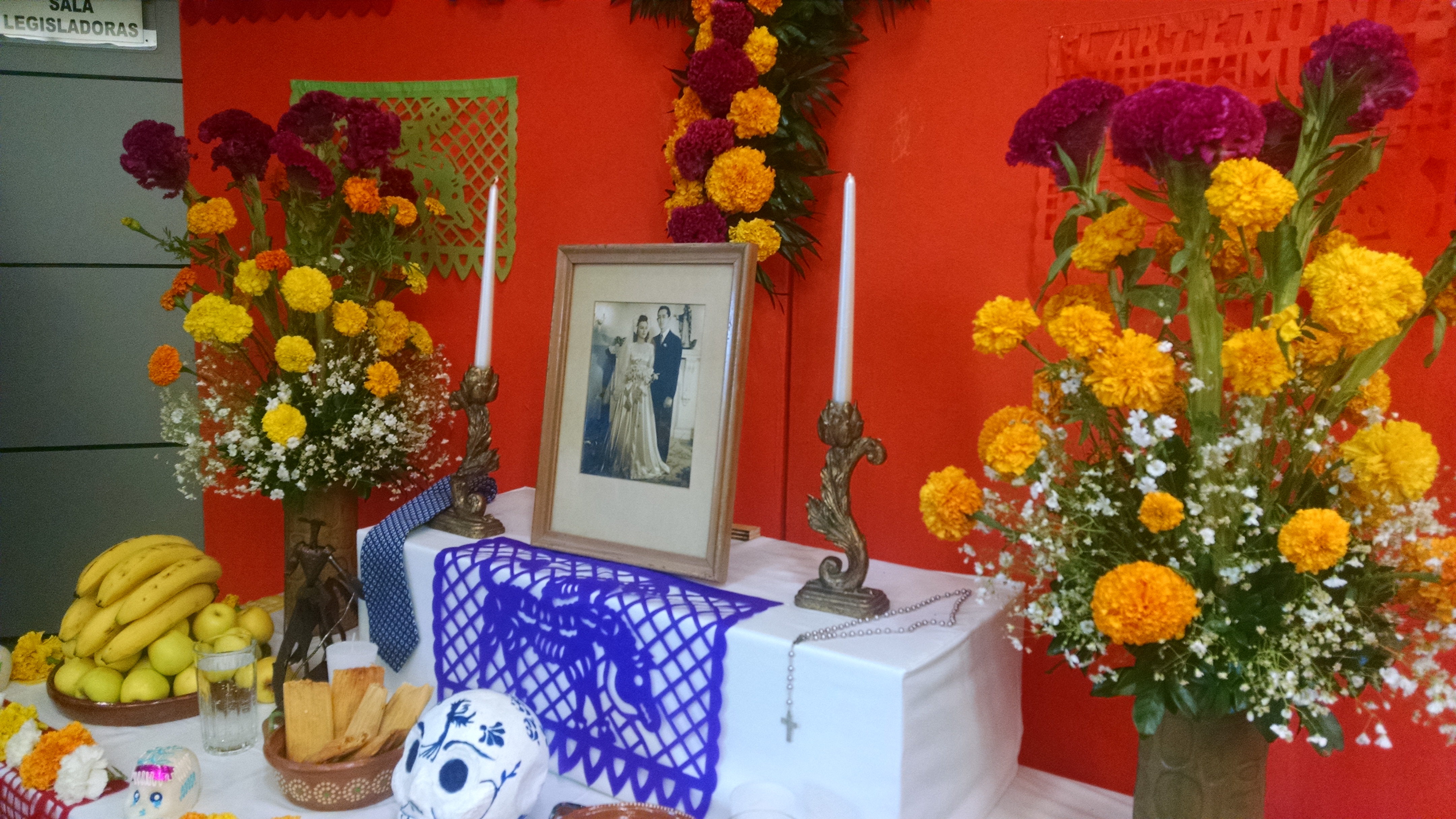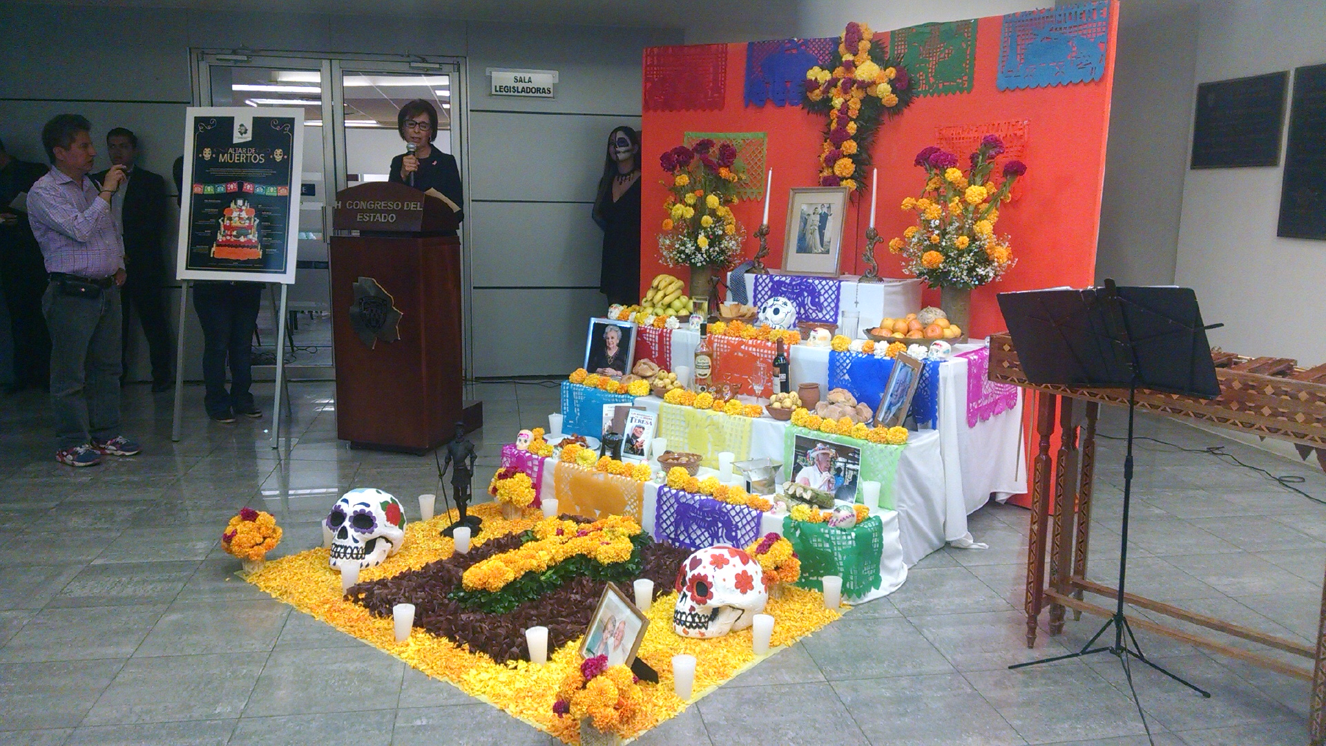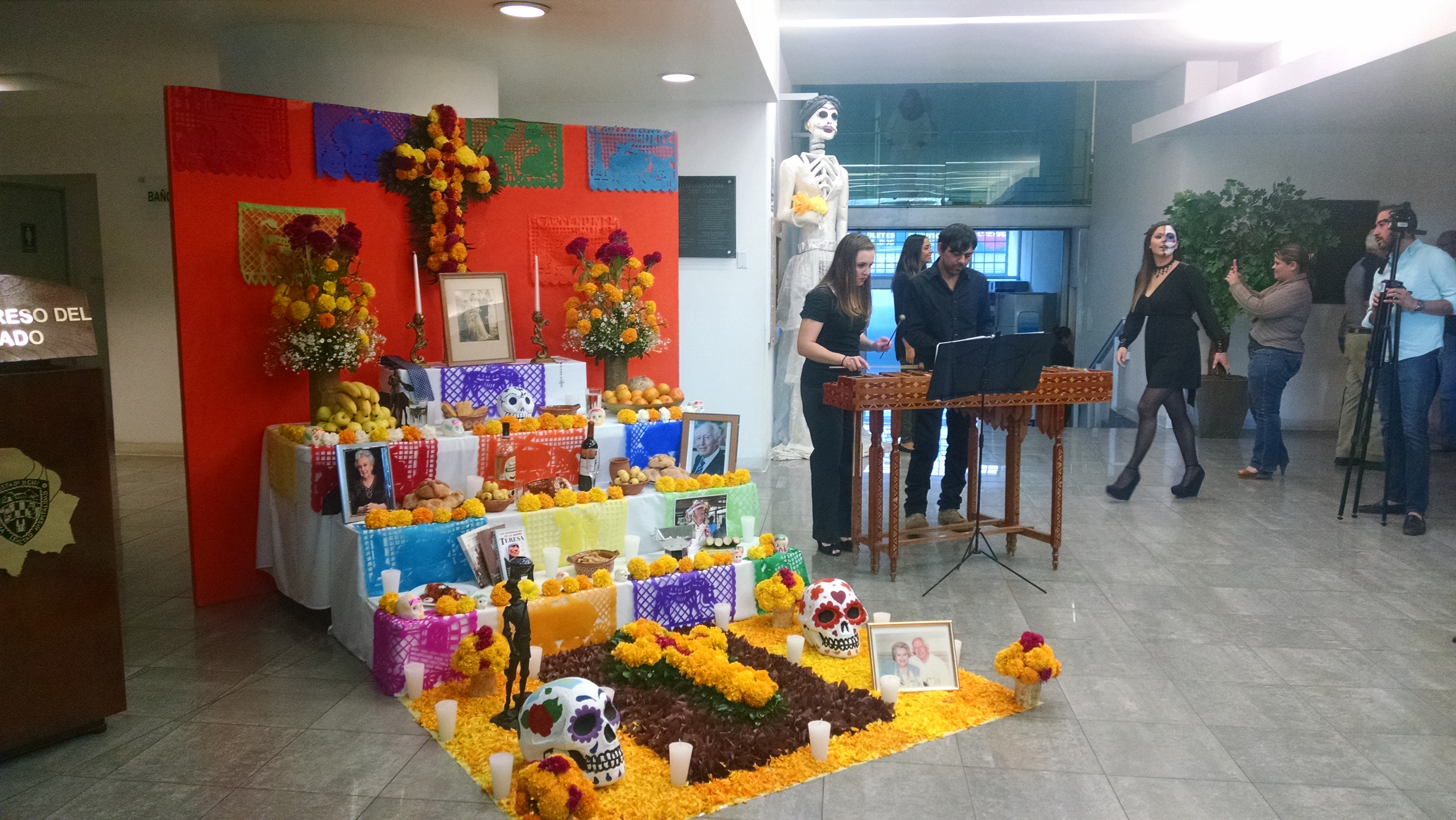 Con dos catrinas a la entrada del edificio dando la bienvenida, el Congreso del Estado celebró hoy la tradición mexicana del día de muertos, esto con un altar en honor al panista Luis H. Álvarez y su esposa, Blanquita Magrassi.
